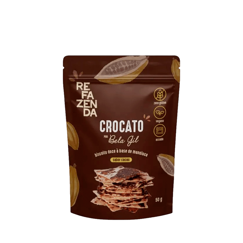 O Biscoito Crocato de Cacau da Refazenda é uma opção vegana, sem glúten e sem lactose, elaborada com ingredientes orgânicos e naturais. Feito à base de mandioca, fécula de mandioca e óleo de coco extravirgem, oferece textura crocante e sabor intenso de cacau 70%, sendo ideal para quem busca um lanche saudável e consciente a qualquer momento do dia.
