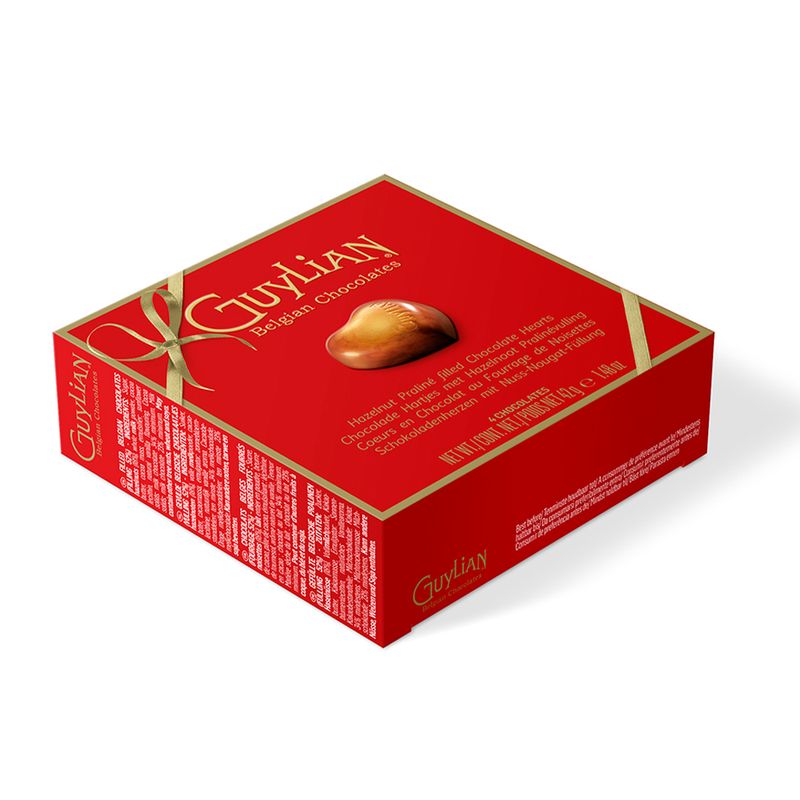 A caixa vem com quatro bombons em formatos de corações e recheados com avelãs.