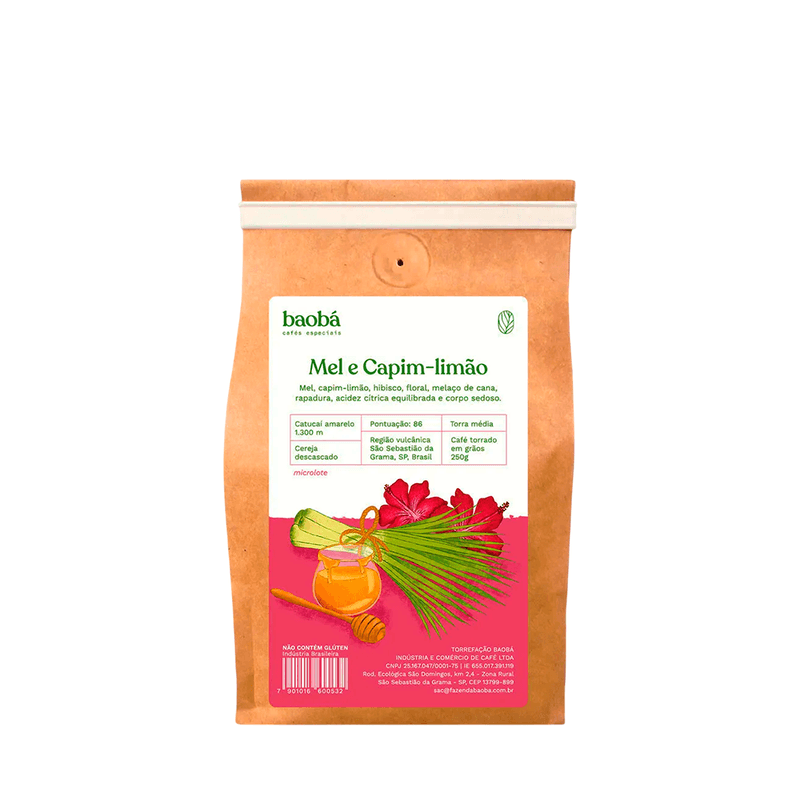 O Café Baobá em grãos Mel Capim-Limão une a qualidade do café brasileiro de torra média a notas aromáticas suaves e refrescantes. A combinação do mel com o capim-limão proporciona uma bebida equilibrada, levemente adocicada e perfumada, ideal para quem aprecia cafés especiais com perfil sensorial diferenciado.