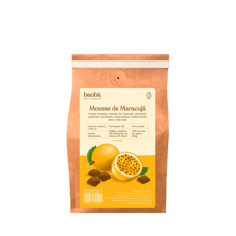O Café Baobá Grão Mousse de Maracujá une a intensidade do café brasileiro à suavidade e frescor do maracujá, resultando em uma bebida aromática e equilibrada. Ideal para quem aprecia cafés especiais com notas diferenciadas e uma experiência sensorial única.