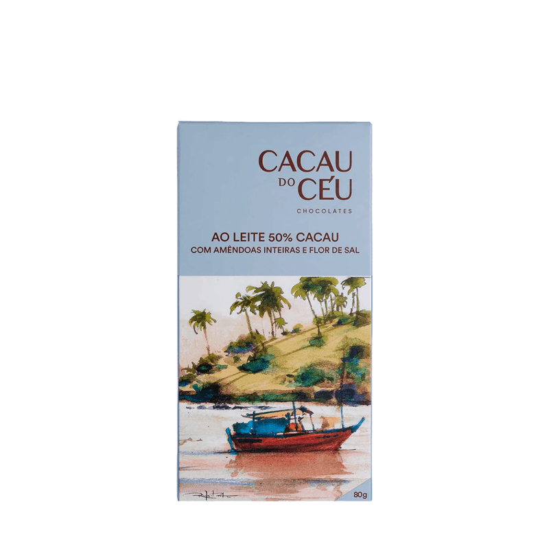 O Chocolate 50% Cacau ao Leite com Amêndoas e Flor de Sal da marca Cacau Céu combina a intensidade do cacau com a cremosidade do leite e o toque especial das amêndoas, realçado pela sofisticação da flor de sal. Uma experiência única para quem aprecia sabores equilibrados e marcantes.
