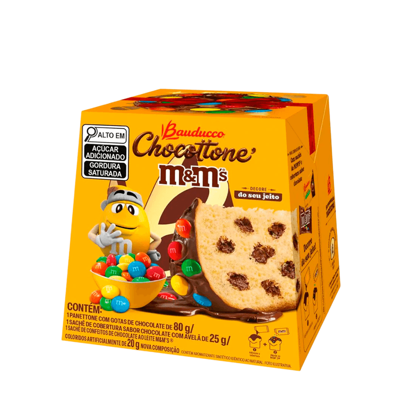 O Mini Chocottone com M&M’s da Bauducco é uma versão prática e deliciosa do tradicional chocottone, com massa macia, gotas de chocolate ao leite e M&M’s coloridos, perfeito para momentos especiais e lanches rápidos.