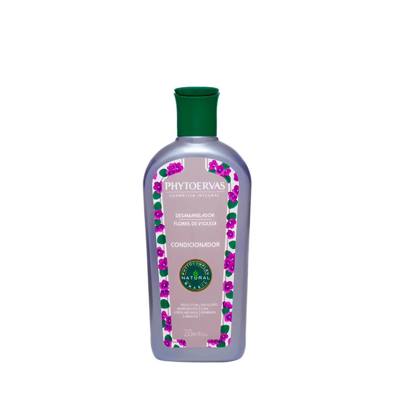 O Condicionador Desamarelador Flores de Violeta Phytoervas complementa o cuidado dos cabelos loiros, grisalhos ou descoloridos, neutralizando tons amarelados e mantendo a cor vibrante. Enriquecido com óleos vegetais, manteigas nutritivas e extratos de flores e folhas, promove maciez, brilho, hidratação profunda e proteção dos fios. Ideal para uso diário, garantindo cabelos saudáveis e bem cuidados.