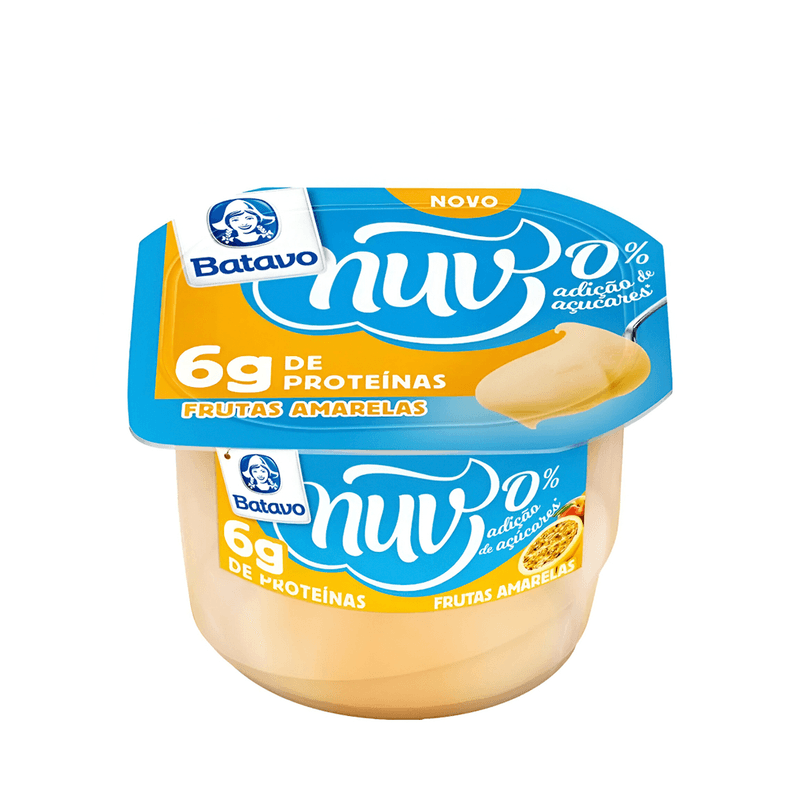 Ingredientes: Leite desnatado e/ou leite desnatado reconstituído, preparado de frutas amarelas (água, amido modificado, polpa de pêssego, polpa de maracujá, cálcio, aromatizante, corante extrato de urucum, conservador sorbato de potássio, edulcorante sucralose e acidulante ácido cítrico), creme de leite, cloreto de cálcio, fermentos lácteos e coagulante.