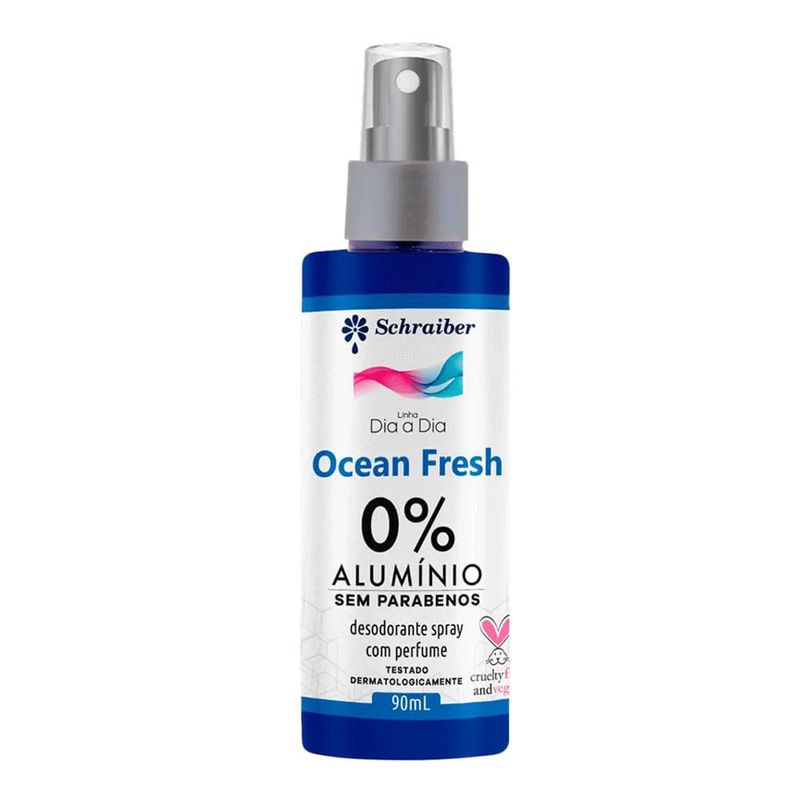 O Desodorante Spray 0% Alumínio Ocean Fresh da Schraiber possui fórmula com ingredientes naturais e sem hidróxido de alumínio, recomendado para todos os tipos de pele. Possui grande compatibilidade com a pele e impede a proliferação de bactérias que geram odores, devido à ação adstringente que regula a transpiração. Por não conter sais de alumínio na fórmula, não interfere na respiração natural da pele, não obstruindo os poros e respeitando o equilíbrio da pele. Além disso, são Cruelty Free e Vegan, 100 % veganos e certificados pelo PETA.