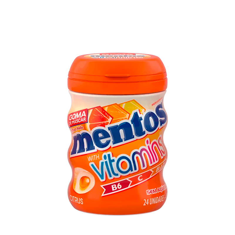 A Goma Mentos Vitamins Citrus traz refrescância e sabor cítrico aliado a vitaminas essenciais como C, B6 e B12. Prática e saborosa, é ideal para quem busca frescor no dia a dia, em qualquer lugar.