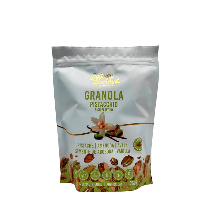 A Granola de Pistache Delicious Healthy é uma opção nutritiva, vegana e naturalmente adoçada com calda de tâmaras. Produzida com aveia, sementes de abóbora, pistache, amêndoas e chia, combina crocância e sabor único. Sem glúten, sem lactose e sem adição de açúcar, é perfeita para começar o dia com energia, podendo ser consumida com frutas, iogurtes ou pura como snack saudável.