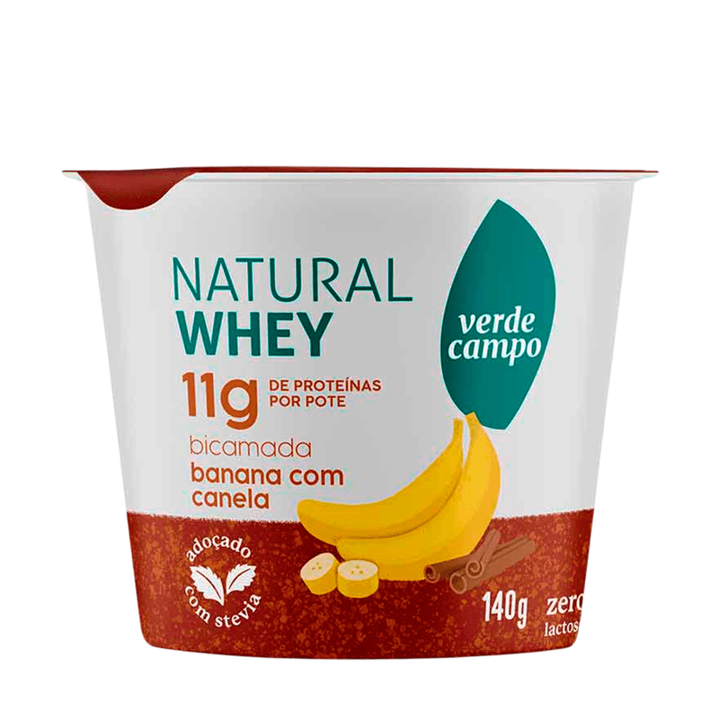 O Iogurte Natural Whey Bicamada Sabor Banana com Canela 11g de Proteína Verde Campo une o sabor marcante da banana e da canela em uma textura cremosa. Fonte de proteína, é uma excelente opção de lanche nutritivo e equilibrado.