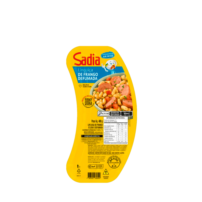 Ingredientes: Carne mecanicamente separada de frango, carne suína, gordura suína, carne de frango, água (5,60%), amido (4,60%), proteína de soja (3,40%), pele suína, sal, açúcar, alho, extrato de levedura, canela, coentro, noz-moscada, aromatizantes (aroma natural e aroma idêntico ao natural), espessante: carragena, estabilizantes: tripolifosfato de sódio e pirofosfato dissódio, realçador de sabor: glutamato monossódico, antioxidante: isoascorbato de sódio, acidulante: ácido cítrico, conservador: nitrito de sódio, regulador de acidez: citrato de sódio e corante: carmim de cochonilha.