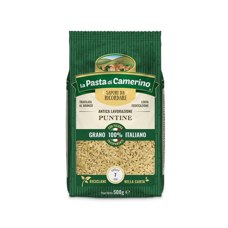 O Macarrão de Sêmola Puntine La Pasta di Camerino é uma variedade charmosa e versátil de massa italiana, caracterizada por seu formato pequeno e pontiagudo. Feito com sêmola de trigo duro, o Puntine tem uma textura robusta que é excelente para absorver molhos e sabores, tornando-o ideal para uma ampla gama de pratos.