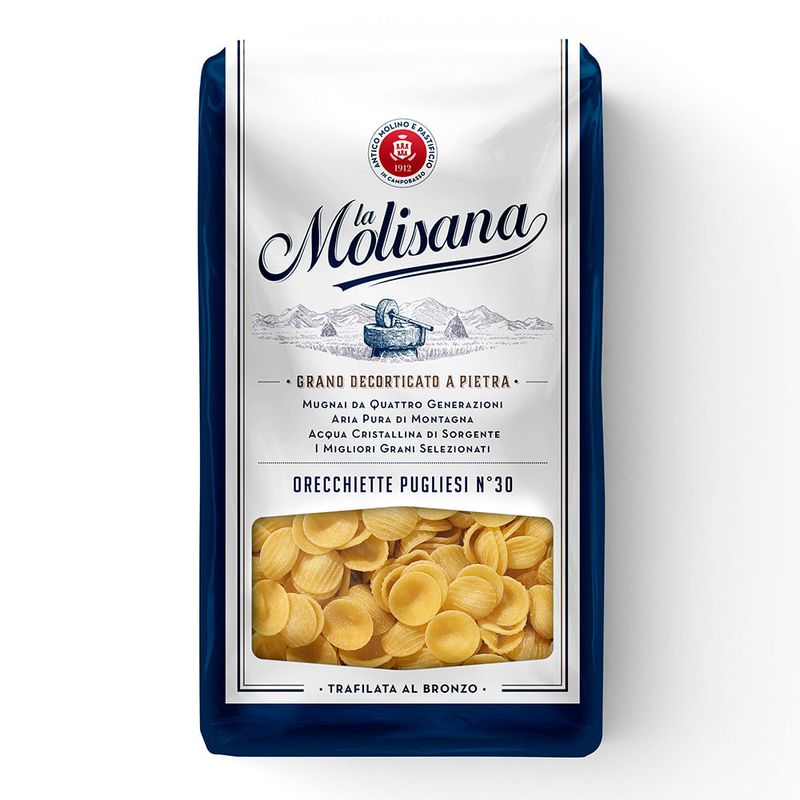 O Macarrão Orecchiette Pugliesi da La Molisana é geralmente cozido com nabos, e também é delicioso com todos os molhos de legumes. Ele tem uma forma que lembra um disco, com uma borda ligeiramente mais grossa que a interna, mais fina. Ele tem uma textura enrugada e listras profundas de um lado, para melhor acomodar os temperos com generosidade. O chef o aprimora com um molho de cardo gobbi muito original, servido em beringela e depois polvilhado com queijo ricota, pétalas crocantes de tomate seco e perfumado com orégano da montanha