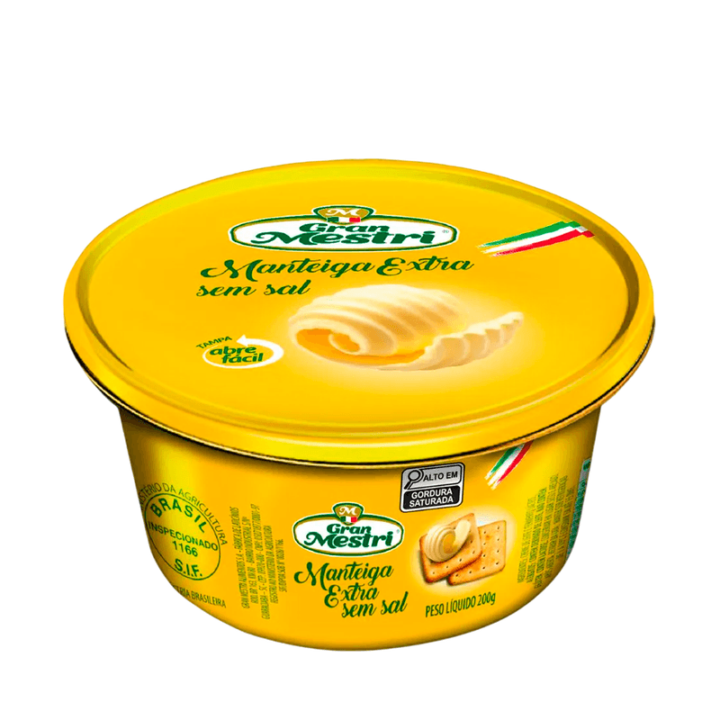 A Manteiga Extra Sem Sal Gran Mestri é elaborada a partir de creme de leite pasteurizado e fermento lácteo, garantindo sabor puro, textura cremosa e alta qualidade. Ideal para uso culinário, preparo de receitas, panificação ou para consumo diário, realçando o sabor natural dos alimentos sem adição de sal.