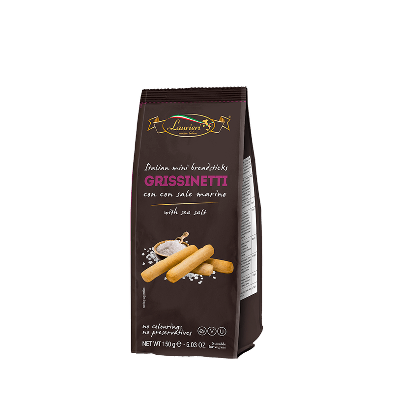 Os Mini Grissini Sal Marinho Laurieri são deliciosos palitinhos crocantes de massa leve, preparados com azeite de oliva e sal marinho. Perfeitos para acompanhar queijos, antepastos e patês, são ideais para petiscar ou servir em tábuas gourmet.