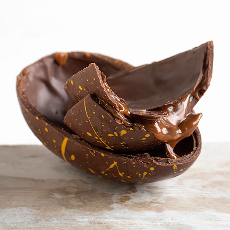 Caramelo e Flor de Sal com chocolate belga ao leite (41% cacau) é definitivamente um daqueles encontros de ingredientes que conquistou os paladares e veio para ficar. A doçura do caramelo com os cristais de sal cria uma percepção suave de sabores e textura que são complementares e se intensificam. A cremosidade do recheio agrada muito quem busca um ovo de páscoa de sabor elaborado, mas também quer se permitir uma experiência prazerosa de um doce mais intenso.