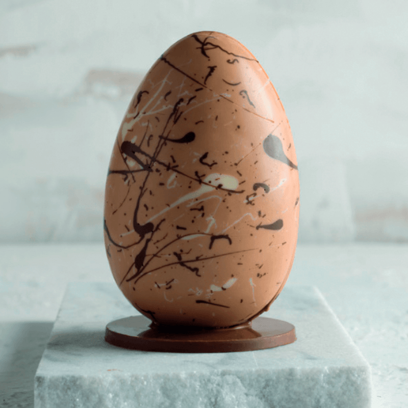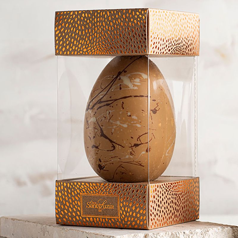 Ovo que combina 2 tipos de chocolate em um só - meia casca de chocolate belga ao leite (41% cacau) e a outra metade de chocolate gold (30,4% cacau). Além da proposta que mescla tipos de chocolate, em toda a casca adicionamos o crocante de amêndoas exclusivo da casa, com toque de cumaru.