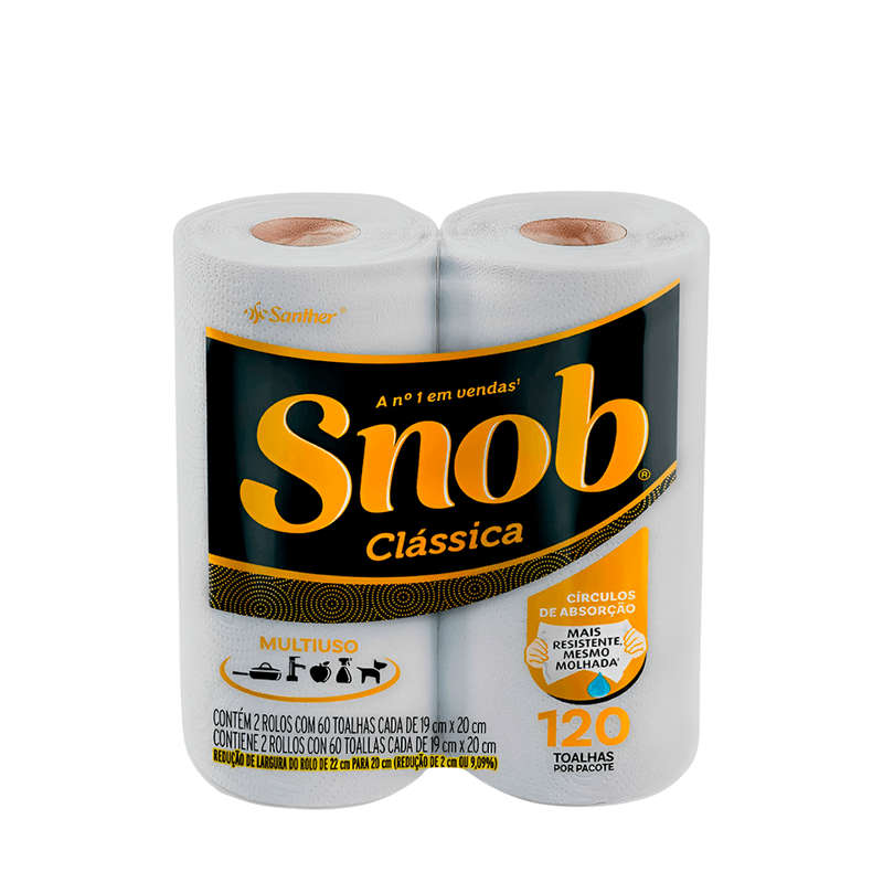 O Papel Toalha Snob oferece alta absorção e resistência, ideal para o dia a dia. Com embalagem contendo 2 rolos de 120 folhas cada, é produzido com 100% de fibras celulósicas, sendo picotado e gofrado para maior praticidade e eficiência.