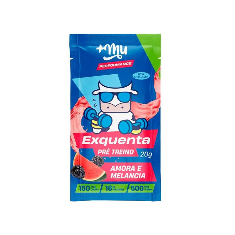 O Pré Treino Exquenta +Mu ajuda a acelerar o metabolismo, tira a sensação de fadiga sem causar efeitos colaterais negativos (como a taquicardia), é zero lactose e zero glúten, melhora a performance física e previne a perda de massa magra.