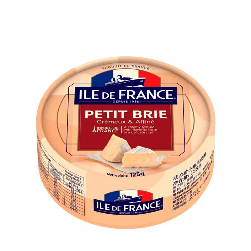 O Queijo Petit Brie Ile de France é um queijo de massa mole e casca branca aveludada, produzido a partir de leite integral pasteurizado. Possui textura cremosa, sabor suave e notas amanteigadas, características típicas dos queijos franceses tipo brie.